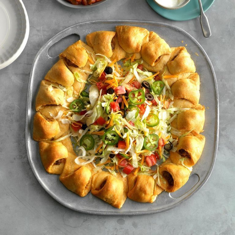 Embora pareça complicado, esse atraente anel cheio de almôndegas é realmente muito fácil de montar. Minha família adora tacos, e descobrimos que a massa de rolo crescente é uma boa mudança em relação às costeletas de tortilla ou às batatas fritas. Nunca há qualquer sobra quando eu sirva isso em uma refeição ou como um aperitivo de festa! - Brenda Johnson, Davison, Michigan