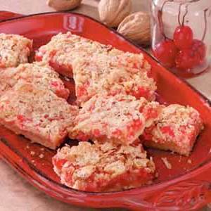 Para o recheio, misture o ovo, as claras, o açúcar e a baunilha numa tigela. Combine a farinha, o fermento e o sal; adicione a mistura de ovo.Mexa em cerejas, nozes e coco.Espalhe sobre a crosta.Bake por 20-25 minutos ou até firma.Cool em uma cremalheira de fio.Corte em bares.Refrigerar as sobras.