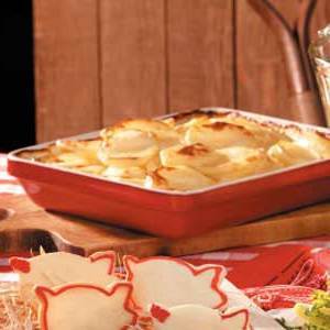 Transfira para uma assadeira rasa untada.Cubra e leve ao forno a 325 ° por 1 hora.Uncobrir; Asse 30-40 minutos a mais ou até que as batatas estejam macias.