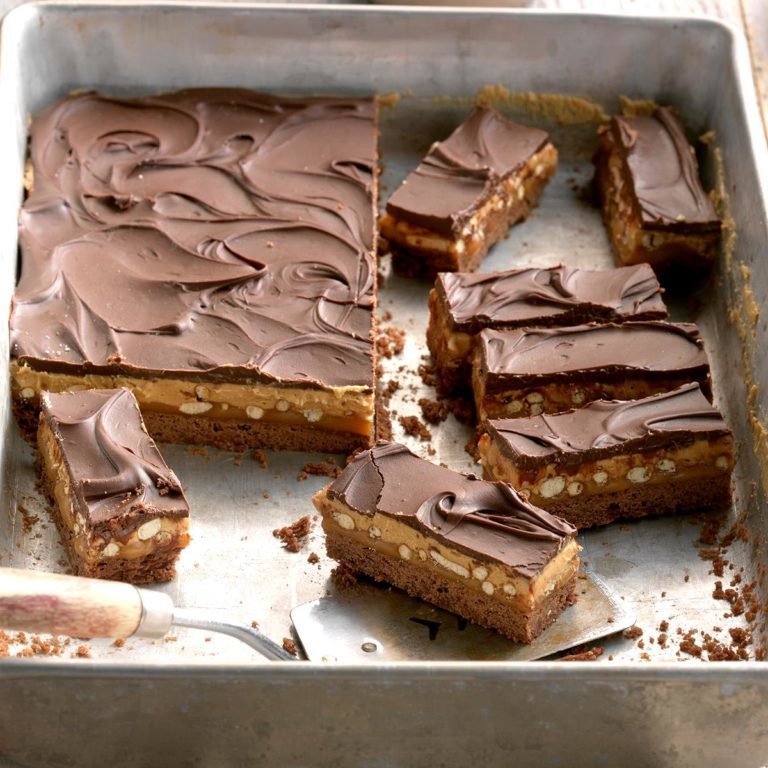 As férias são o momento perfeito para se deliciar com estas barras de manteiga de amendoim salgadas e doces. Muitas pessoas comentam que os pretzels no recheio são uma agradável surpresa. Apenas certifique-se de cortar as barras de biscoito - elas são super rica. - Megan Behr, Marion, Iowa