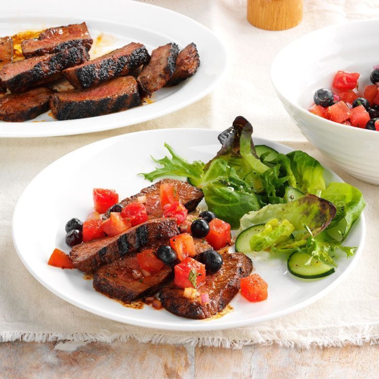 A primeira vez que provei isso, fiquei espantado com a boa qualidade dos blueberries e da melancia com o bife apimentado. Use as frutas que houver na estação para que possa servir a qualquer momento. - Veronica Callaghan, Glastonbury, Connecticut