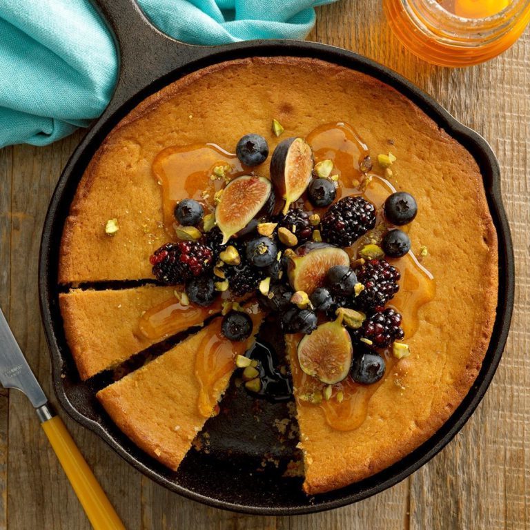 Asse até que um palito inserido no centro sai limpo, 30-35 minutos.Cool completamente em panela em uma cremalheira de fio.Serve com frutas, mel adicional e, se desejado, pistache picado.