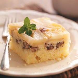 Usando uma mistura de bolo embalada acelera o tempo de preparação deste saboroso bolo de outono. Recoberto com nozes vermelhas e peras douradas, este bolo húmido é bonito de se ver e delicioso também. - Sabor da cozinha de teste caseiro