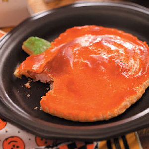 Em uma tigela pequena, bata as gemas com corante vermelho suficiente para obter uma cor laranja. Em outra tigela pequena, bata a clara de ovo com corante verde. Misture a mistura de laranja sobre as bordas da massa. Tampe com as abóboras restantes. Pressione as bordas para selar; aparar bordas com uma roda de pastelaria canelada. Brush caules com mistura verde e abóboras com laranja.