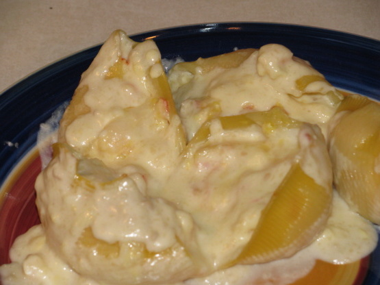 Escorra suas cascas de macarrão e corra sob água fria até que você possa lidar com elas. Coisas com a mistura de queijo e frutos do mar.
