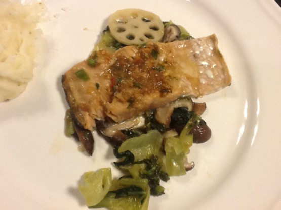 Faça e compartilhe esta receita de Salmon Bulgogi com Bok Choy e Mushrooms.