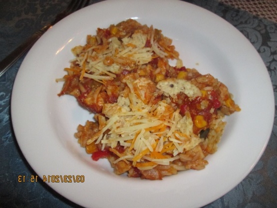 Aqueça o forno a 350.Spray Uma tigela com uma capacidade de 2 litros contendo caçarola com spray de cozinha.Na caçarola, mexa frango, arroz, tomate, sopa, milho, chiles, mistura de tempero taco e 1/4 litro de queijo até bem misturado .