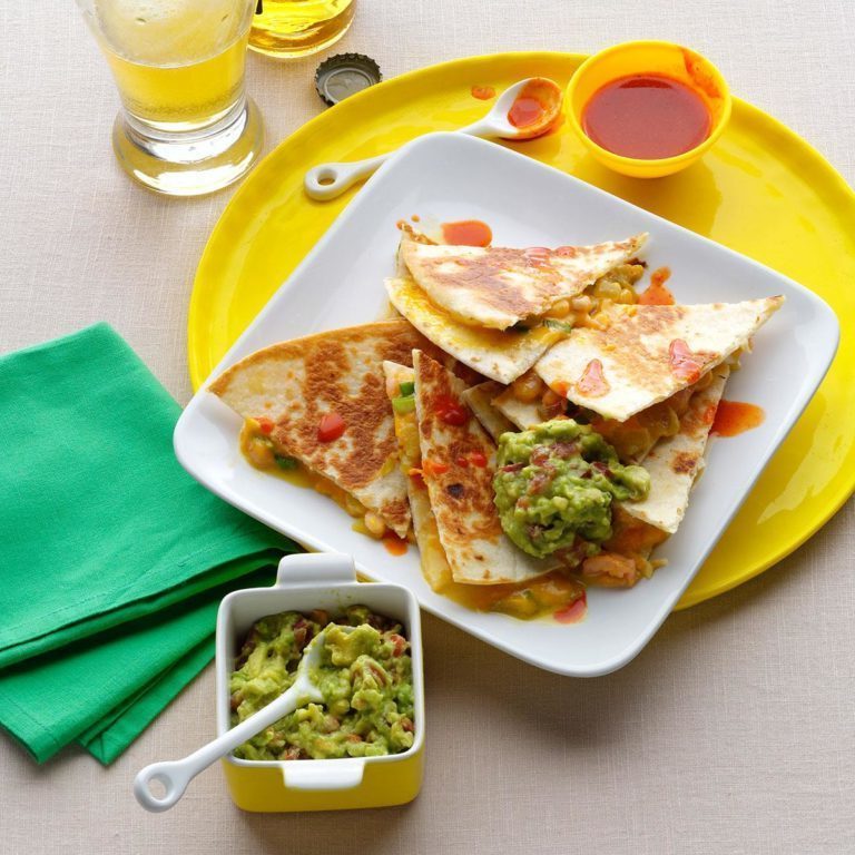 Enquanto isso, em uma tigela pequena, amasse o abacate com salsa e sal de alho. Sirva com quesadillas.