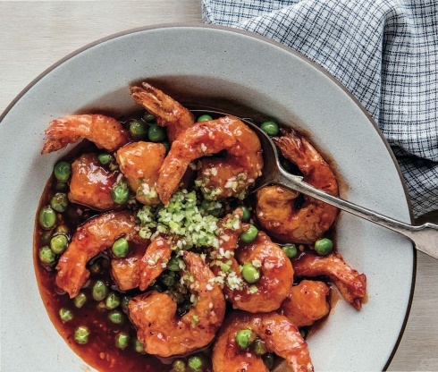 Transfira o camarão para um prato, guarneça com as cebolas verdes e as ervilhas (se usar) e sirva imediatamente.