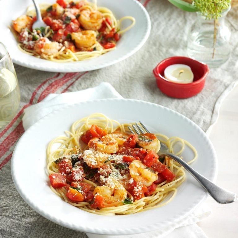 Meu marido e eu temos horários agitados, por isso estou sempre à procura de refeições rápidas que tenham apelo para ocasiões especiais. Camarão com alho, tomate e macarrão é um vencedor. - Catherine Jensen, Blytheville, Arkansas