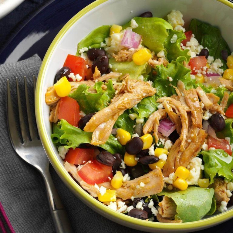 Esta carne de porco desfiada faz uma salada saudável, deliciosa e saudável com feijão preto, milho, queijo cotija e muitos verdes frescos. - Mary Shivers, Ada, Oklahoma