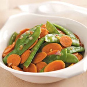 Em uma frigideira de ferro fundido grande ou wok, frite as cenouras na manteiga por 3 minutos Adicione as ervilhas, cebola e sal; frite por 2 minutos ou até que os legumes estejam crocantes.