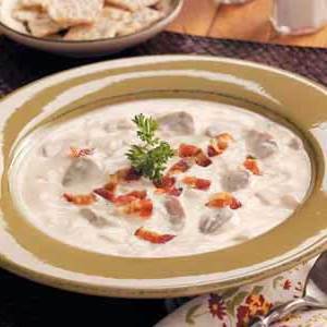 Em uma panela grande, cozinhe o bacon em fogo médio até ficar crocante. Usando uma escumadeira, remova as toalhas de papel; drenar, reservando 2 colheres de sopa de gotas. Nos gotejamentos, refogue os cogumelos e a cebola até ficarem macias. Adicione o alho; Cozinhe 1 minuto a mais. Mexer em creme e caldo. Aos poucos, misture o queijo até derreter.