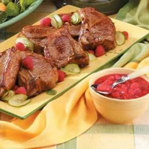 Enquanto isso, em uma frigideira grande, refogue o alho no óleo até ficar macio.Adicione costeletas de cordeiro.Cozinhe, descoberto, por 7-10 minutos de cada lado ou até que a carne atinja o cozimento desejado (para médio-raro, um termômetro deve ler 145 °; médio , 160 °; bem feito, 170 °) .Serve com molho de framboesa.