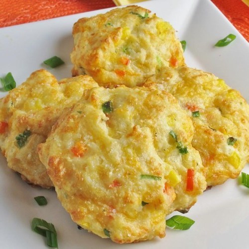 Em uma tigela grande, misture a farinha, o fermento, o sal, o óleo e o leite. O volume deve ficar um pouco pegajoso. Adicione pimentões, milho e queijo refogados. Distribua colheradas de massa sobre folhas de biscoito levemente untadas.