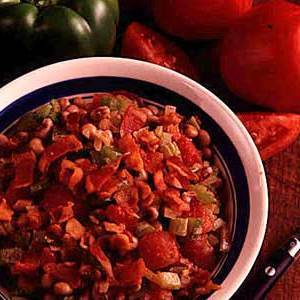 Em uma frigideira, aqueça o óleo sobre médio-alto.Saúde pimenta verde, cebola e aipo.Adicione açúcar, louro, ervilhas, tomate, metade do sal e pimenta tomate.Reduza o fogo e cozinhe por 15 minutos.Retire a uma tigela e polvilhe com bacon.Serve quente ou à temperatura ambiente..