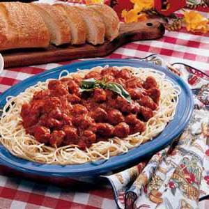 Em uma tigela grande, misture o peru, a semente de erva-doce, a água, o sal e a pimenta.Cubra e refrigere a noite.Crie em pedaços pequenos em uma frigideira grande.Cozque em fogo médio até deixar de cor-de-rosa.Molte em molho de espaguete e aqueça .Serve com espaguete quente..