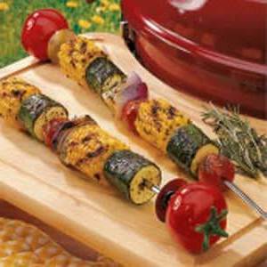 Minha mãe e eu adoramos comer legumes da maneira mais saborosa - grelhados! Temperados com ervas frescas, esses kabobs coloridos mostram o melhor da generosidade do verão. - Susan Bourque, de Danielson, Connecticut