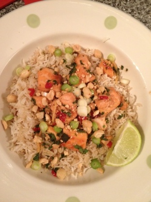 Sirva com arroz (de preferência arroz de jasmim) e espalhe sobre os amendoins e cebolinhas.