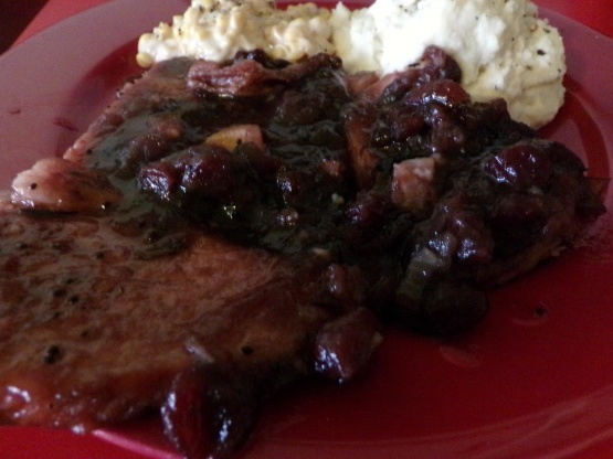 Isso faz uma maravilhosa refeição rápida que leva apenas alguns minutos para juntar, as quantidades de molho listadas são suficientes para 2-3 fatias de presunto, você pode dobrar ou triplicar para mais fatias - eu até fiz isso usando geléia de uva no lugar da Molho de cranberry, se desejar você pode dourar as fatias de presunto em ambos os lados antes de adicionar ao molho, isso é * muito * bom! :)