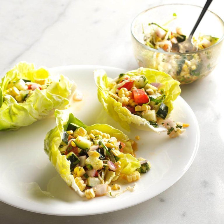 Usando uma escumadeira, coloque 130 litros de salada em cada folha de alface.Dobre a alface sobre o recheio.