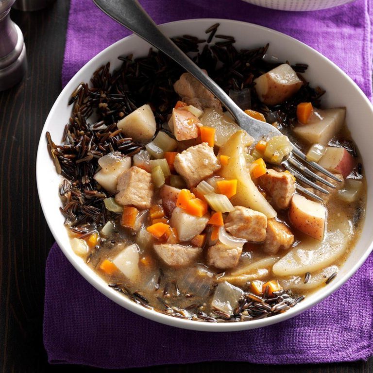 Adicione as batatas e maçã.Cozinhe até ficar macio, 15-20 minutos.Misture o amido de milho e água restante até ficar homogêneo; mexa em guisado.Bring a ferver; cozinhe e mexa até engrossar, 1-2 minutos.Discardine as folhas de louro.Serve sobre o arroz selvagem e, se desejar, cubra com salsa