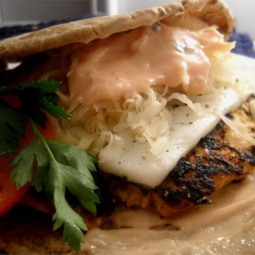 Para montar hambúrgueres, rissóis de peru e queijo, chucrute e cebolas cozidas entre fatias de pão.