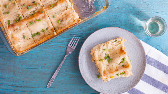 Espalhe 0,25 do molho de queijo (cerca de 3/8 litro) em uma assadeira oblonga não gordurosa (13x9x2 pol.). Top w/3-4 macarrão não cozido (sobreposição, se necessário).