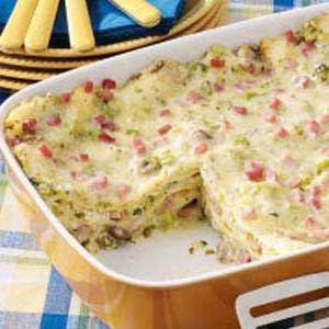 Espalhe a mistura de 1/2 litro de brócolis em uma assadeira untada de 13x9 polegadas. Tampe com quatro macarrões, sobrepondo-os se necessário. Camada com uma tigela com uma capacidade de 1/2 litro contendo mistura de brócolis, Uma tigela com capacidade de 3/8 litros contendo presunto, Um copo com uma capacidade de 170 ml contendo queijo suíço, quatro macarrões, Uma tigela com uma capacidade de 1/2 litro contendo mistura de brócolis, frango, Uma xícara com uma capacidade de 170 ml contendo queijo suíço, quatro macarrão e restante mistura de brócolis, queijo suíço e presunto.