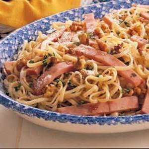 Cook linguine de acordo com as instruções da embalagem.Enquanto isso, em uma frigideira grande, refogue o alho em óleo por 1 minuto.Adicione nozes; refogue por 2 minutos a mais. Mexa no presunto; cozinhe por 2 minutos ou até aquecer