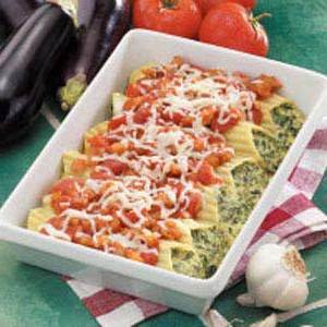 Coloque em um prato 11x7-in.baking revestido com spray de cozinha. Colher de molho de berinjela sobre manicotti; polvilhe com a mussarela restante.Cubra e asse a 350 ° por 25-30 minutos ou até que esteja totalmente aquecido.