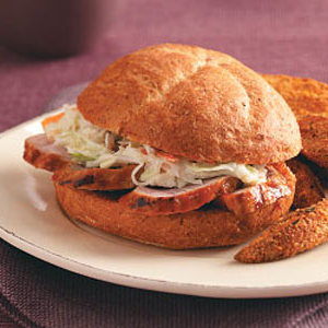 "Eu fiz isso para um churrasco de verão com os hóspedes que adoram sanduíches de churrasco tradicionais, mas que queriam algo mais leve. Eles adoraram e não sentiram falta das calorias extras. A salada de repolho domar dobra o calor!" - Priscilla Yee, Concord, Califórnia