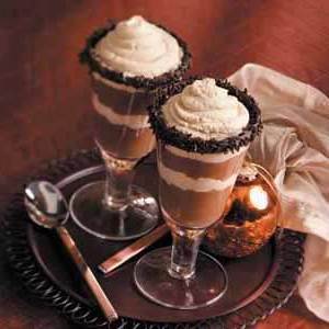 Colher cerca de 60 litros de mousse de chocolate em cada copo de parfait; colher ou canalizar cerca de 60 litros de creme sobre a mistura de mousse.Repita as camadas.Refrigerar durante pelo menos 2 horas.