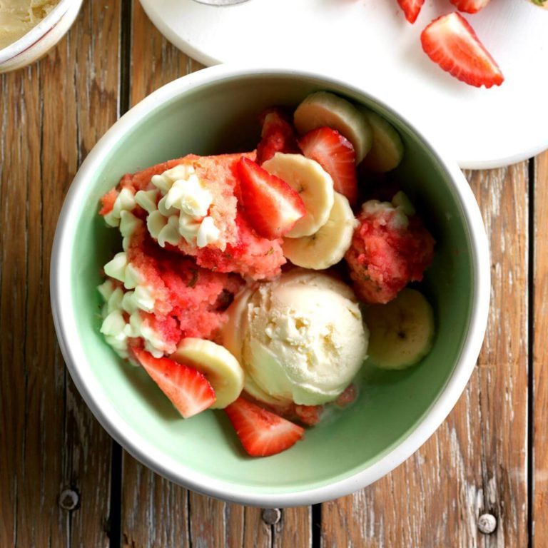 Este bolo de pudim cor-de-rosa é tão fácil de montar. Coloque-o com sorvete e frutas frescas, e você terá uma família muito feliz. - Nadine Mesch, Mount Healthy, Ohio