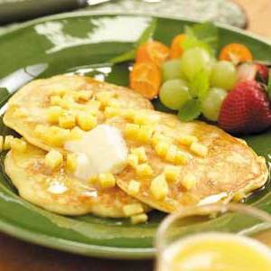 Para o xarope, em uma panela pequena, refogue o abacaxi e a canela na manteiga por 4-6 minutos ou até que o abacaxi esteja dourado. Mexa no xarope de bordo. Sirva com panquecas.