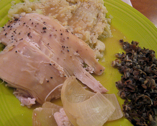 Coloque o peito de peru em cima da cebola (a cebola faz uma pequena prateleira para o peito, para que não fique no fundo da panela).