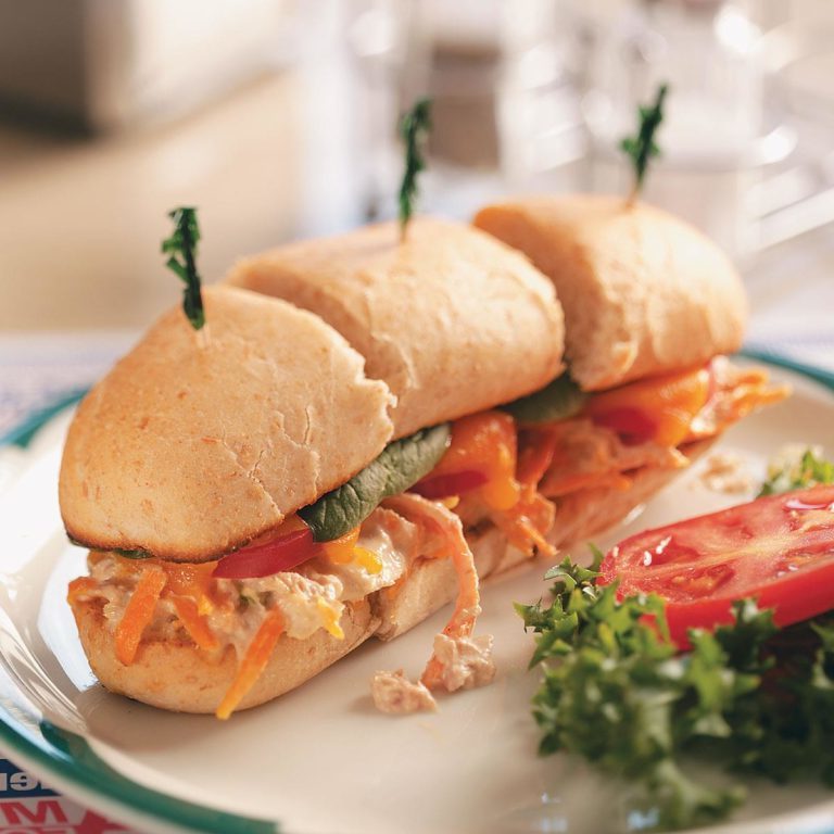 Para ter uma visão mais saudável deste jantar especial, nossa cozinha de teste foi atualizada para pequenas "picadas de melão de atum", bombeando nutrição com pãezinhos integrais, reduzindo calorias substituindo maionese sem gordura e queijo com pouca gordura, e adicionando tomate e espinafre por cima Dê-lhes uma chance! - gosto de cozinhar em casa