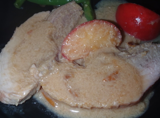 Coloque assado em uma assadeira 23 x 33 centímetros e leve ao forno a 350 por cerca de 45 minutos a 1 hora.Era fora toda a gordura.Na mesma panela, aqueça o vinho, manteiga, geléia de maçã, molho de maçã e creme até bem misturado.Retorno assar na panela e colocar as maçãs ao redor do assado.