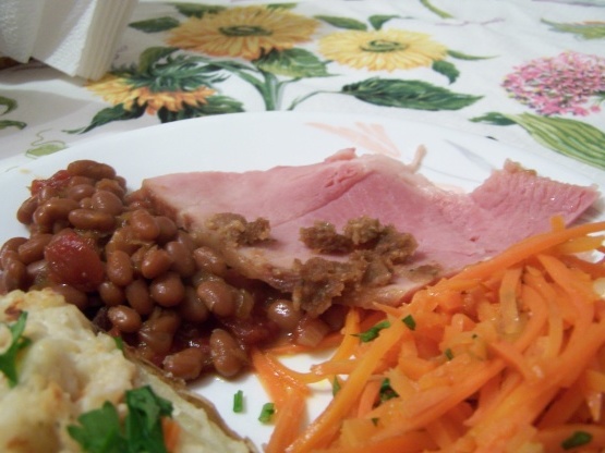 Com base no clássico "Presunto com molho de olhos vermelhos" .O esmalte pode parecer pastoso e confuso quando você o está colocando, mas não se preocupe, ele empresta uma cor e sabor adoráveis ao exterior do presunto. tolo enganá-lo, a maioria da culinária para este delicioso presunto é a caça furtiva em cima do fogão.Isso mantém o presunto muito úmido eo método da água retira o sal no presunto em vez de concentrá-lo.Receita Dele e Deluca.