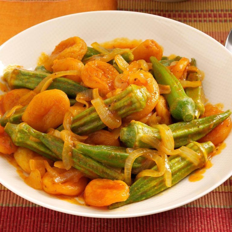 Junte o quiabo, damasco e suco de limão. Retorne a fervura. Reduza o fogo; cubra e cozinhe por 10 a 12 minutos ou até que o quiabo esteja macio.