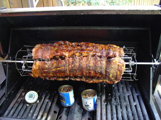 Amarre as costelas ao seu ribcage.Light queimadores inferior da sua grade em alta, e queimador de volta em baixo, e queimar qualquer coisa de seu último uso.Fio escova e remova metade das grades de fundo e reserve.Adicione lascas de madeira enlatada na parte inferior carvões e um termômetro na grelha inferior restante. (Para as lascas de madeira - eu recomendo maçã, carvalho ou nogueira.). Feche a tampa e espere até que os chis madeira são fumantes.Coloque o "costela" cuspir no rotisserie de seu grill.Meia fechar a tampa, eu uso uma chave como um espaçador). Desligue os queimadores de fundo, ligue o motor do rotisserie.Tente regular a temperatura para cerca de 230F, ajustando a abertura da tampa, ea temperatura do queimador ( baixa a média baixa. Deixar girar por 4-5 horas, até que a carne tenha encolhido um pouco para fora do osso e elas estejam macias e de dar água na boca, depois corte-as para fora da gaiola e desfrute.