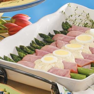 Coloque três lanças de espargos em cada fatia de presunto. Prenda com palitos de dente, se necessário. Coloque em uma panela de 13 pol. cubra com o molho.Aboce a 375 ° por 20 minutos ou até que o aspargo atinja o cozimento desejado.Coloque o ovo sobre o molho antes de servir.