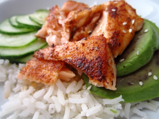 Polvilhe o salmão com sal e pimenta.Grill, virando uma vez, até apenas cozido, cerca de 8 minutos.Transfira para uma placa de corte.Quando esfriar o suficiente para lidar, quebrar em pedaços.
