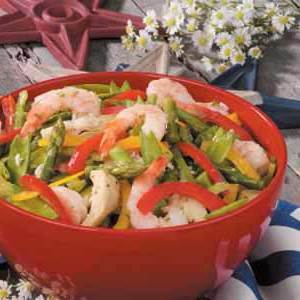 Adicione o aspargo, camarão, alcachofras, ervilhas, pimentões, cebolas e aipo ao arroz. Em uma tigela pequena, bata o azeite, o suco de limão, a salsinha, o molho de soja, a pimenta do limão, o sal e a pimenta. Despeje sobre a mistura de camarão e misture delicadamente. Frio até servir.