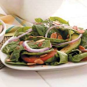 Em uma saladeira grande, misture o espinafre, o tomate, a cebola, o abacate e as amêndoas.