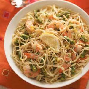 Este medley de camarão apimentado, espargos frescos e massas é sutilmente salpicado com limão.Ele acrescenta um toque de elegância a qualquer reunião ao ar livre ou almoço.Se você fizer isso à frente, adicione o manjericão antes de servir.Serve com copos gelados de chá gelado .-- Laureen Pittman, Riverside, Califórnia