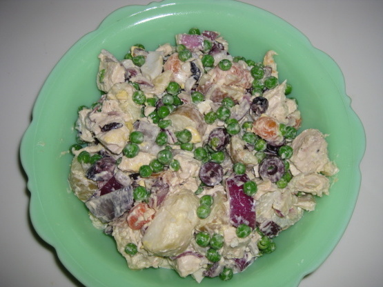 10 minRussobatatas, cenoura, óleo, pepino, cebola, dentes de alho, ervilhas, azeitonas, carne ensopado carne frango ocasiões, maionese, sal, Pimenta,salat -