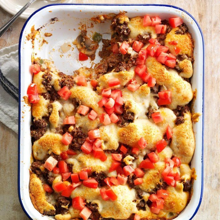 Quando meu marido e eu nos casamos, essa pizza de biscoito resolveu o "o que é para o jantar?" Como nossa família cresceu, acabei de fazer lotes maiores e maiores. - Pat Crane, Pine City, Nova York