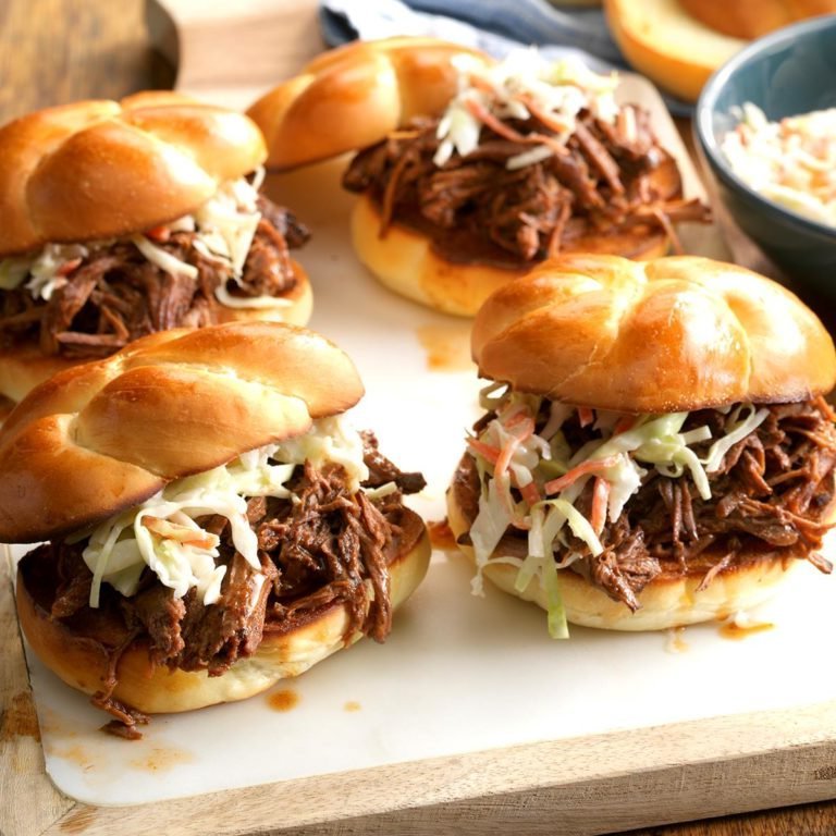 Estes sanduíches de churrasco fazem para os divertidos jantares de fim de verão e são perfeitos para reuniões de potluck também. A cobertura de salada de repolho acrescenta o perfeito sabor crocante. - Gilda Lester, Millsboro, Delaware