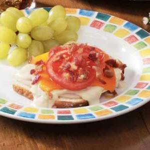Coloque torrada em uma assadeira. Top cada um com 2 fatias de peru; colher reservada molho branco sobre a Turquia.Top cada um com uma fatia de queijo e 2-3 fatias de tomate.Queimar, descoberto, a 350 ° por 25-30 minutos ou até dourar levemente.Polvilhe com bacon.